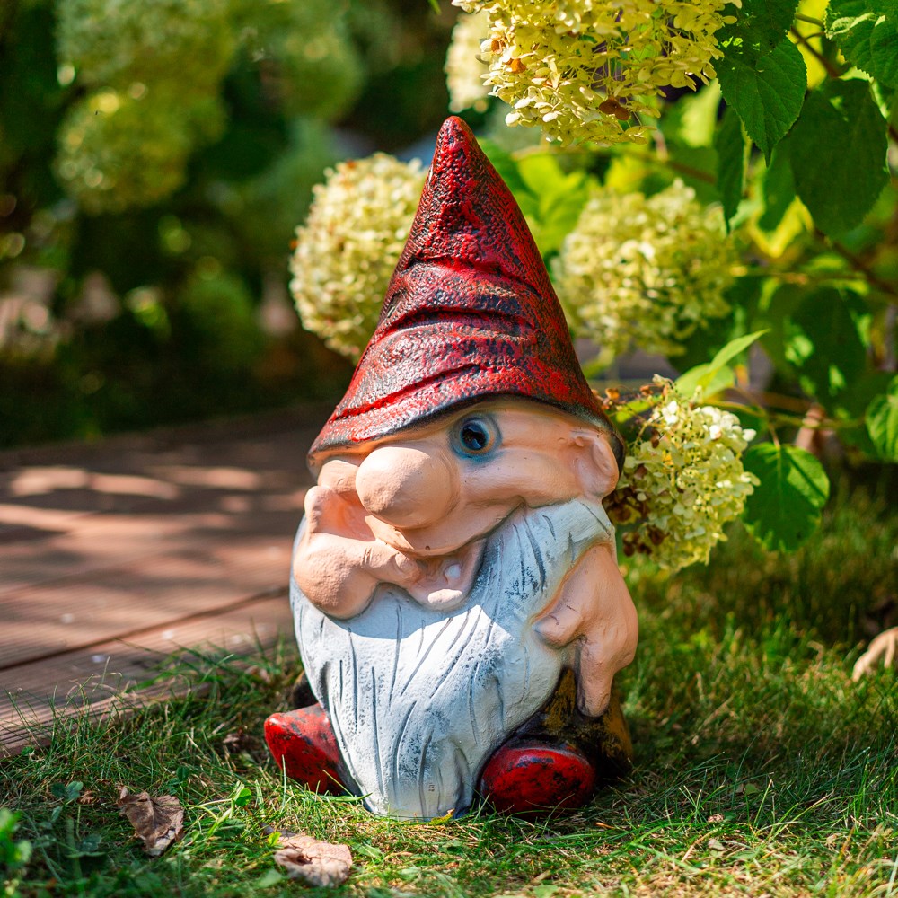 Садовая фигура Гном выполнена из прочного материала - полистоуна. Такую фигурку можно разместить не только в саду, но и на детской площадке.