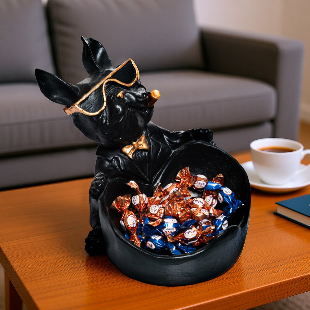 Конфетница декоративная «Бульдог» U09392B — элегантный аксессуар в чёрно‑золотой гамме, выполненный из полистоуна. Стильная фигурка французского бульдога в очках и с бантиком служит удобной чашей для конфет, драже, орехов или мелочей, сочетая в себе декоративность и практичность.