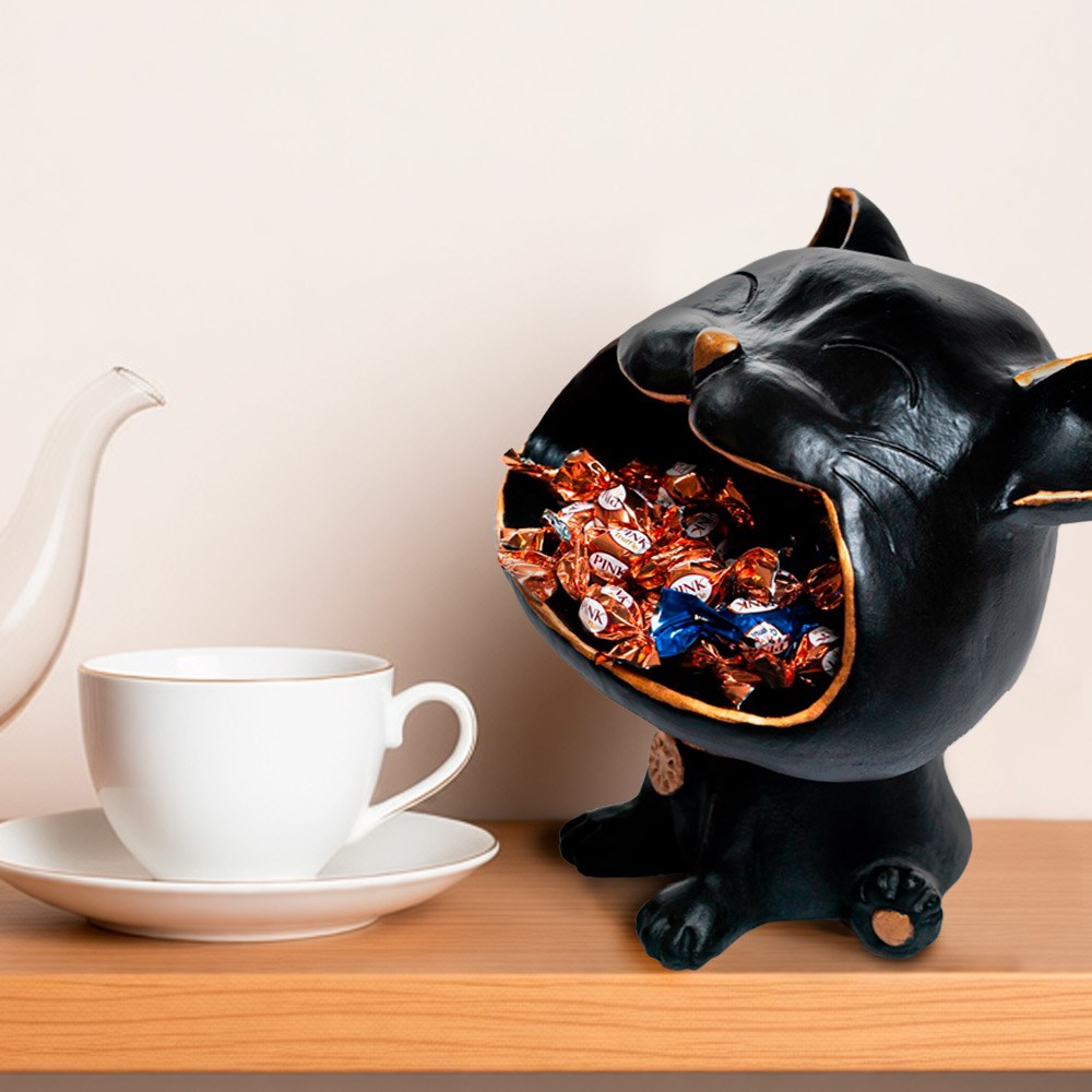 Конфетница декоративная «Кот» U09396B — стильный чёрно‑золотой аксессуар из полистоуна, который объединяет в себе практичность и оригинальный декор. Фигурка кота с открытым ртом‑чашей подходит для сервировки конфет, орешков, драже или хранения мелочей — ключей, украшений, канцелярии.