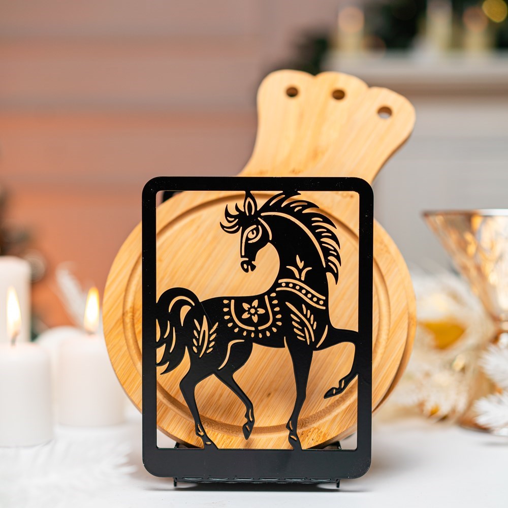 Эта металлическая подставка с изящным узором Конь 300-234B — идеальное решение для хранения разделочных досок. Она обеспечивает циркуляцию воздуха, чтобы доски оставались сухими и чистыми, защищая их от плесени. Прочная конструкция выдерживает даже тяжёлые доски, а уникальный дизайн станет изюминкой вашей кухни, добавляя ей нотку классики и уюта. Практичность и элегантность в каждой детали. Узор в виде грациозной лошади - символа 2026 года, что позволяет размещать подставку на праздничном столе.