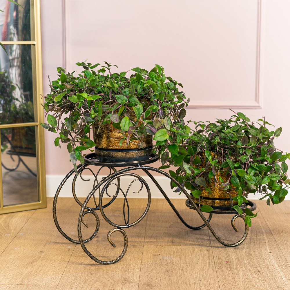 Подставка напольная на 2 растения металлическая 401-035BG — элегантное и практичное решение для размещения ваших горшков в интерьере или на балконе. Изящный кованый дизайн с плавными завитками и ажурными подставками придаёт композиции лёгкость и винтажный шарм, а прочный металлический каркас обеспечивает устойчивость и долговечность.