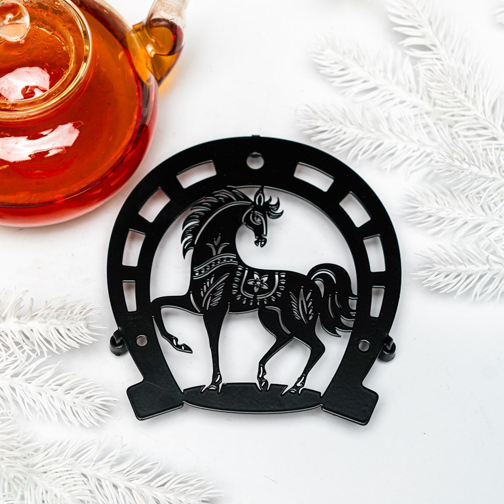 Изящная металлическая подставка с силуэтом Лошади 300-133B — это не просто защита для столешницы, а стильный символ предстоящего года: силы, свободы, верности и доброй удачи. Чёрное матовое исполнение подчёркивает графичность силуэта, делая его ярким акцентом даже в минималистичной обстановке.