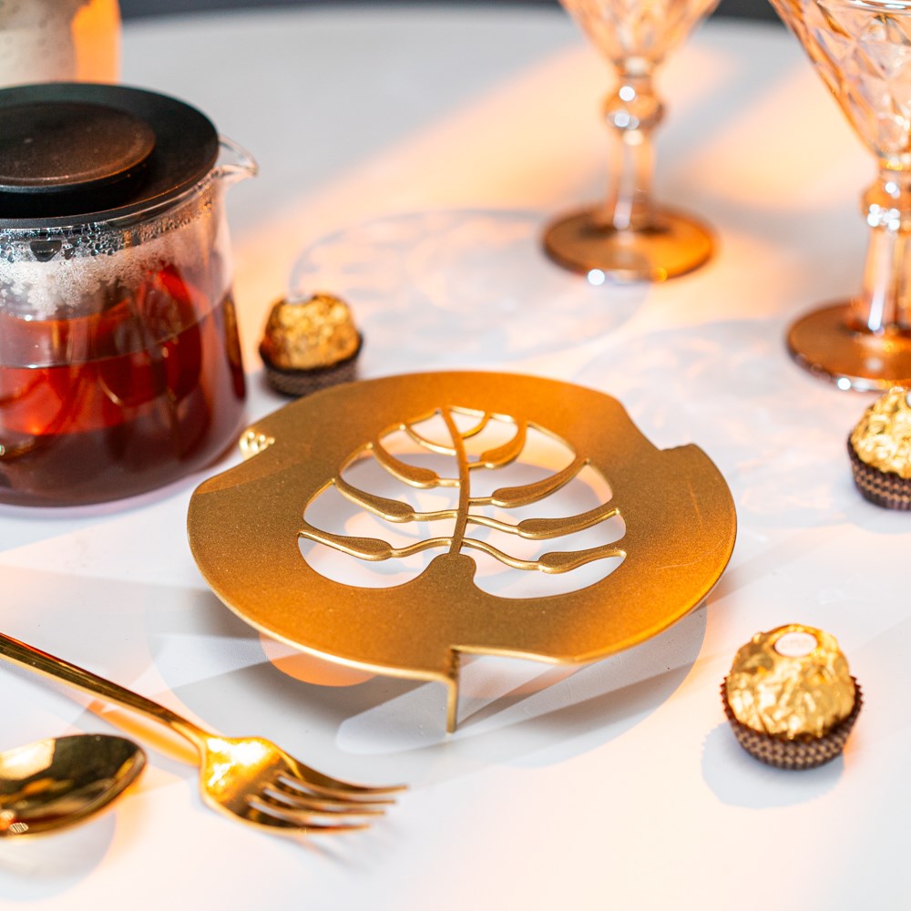 Подставка под горячее «Монстера» 300-132G — золотой лист элегантности. Превратите сервировку стола в искусство! Золотая подставка в виде листа монстеры — это не просто функциональный аксессуар, а изысканный декор для вашей кухни или столовой. Она надёжно защитит поверхность стола, добавив в обстановку ноту тропического шика и уюта. Позвольте себе наслаждаться любимыми напитками и блюдами, не беспокоясь о столешнице. Эта металлическая подставка под горячее станет вашим незаменимым помощником и стильным украшением.