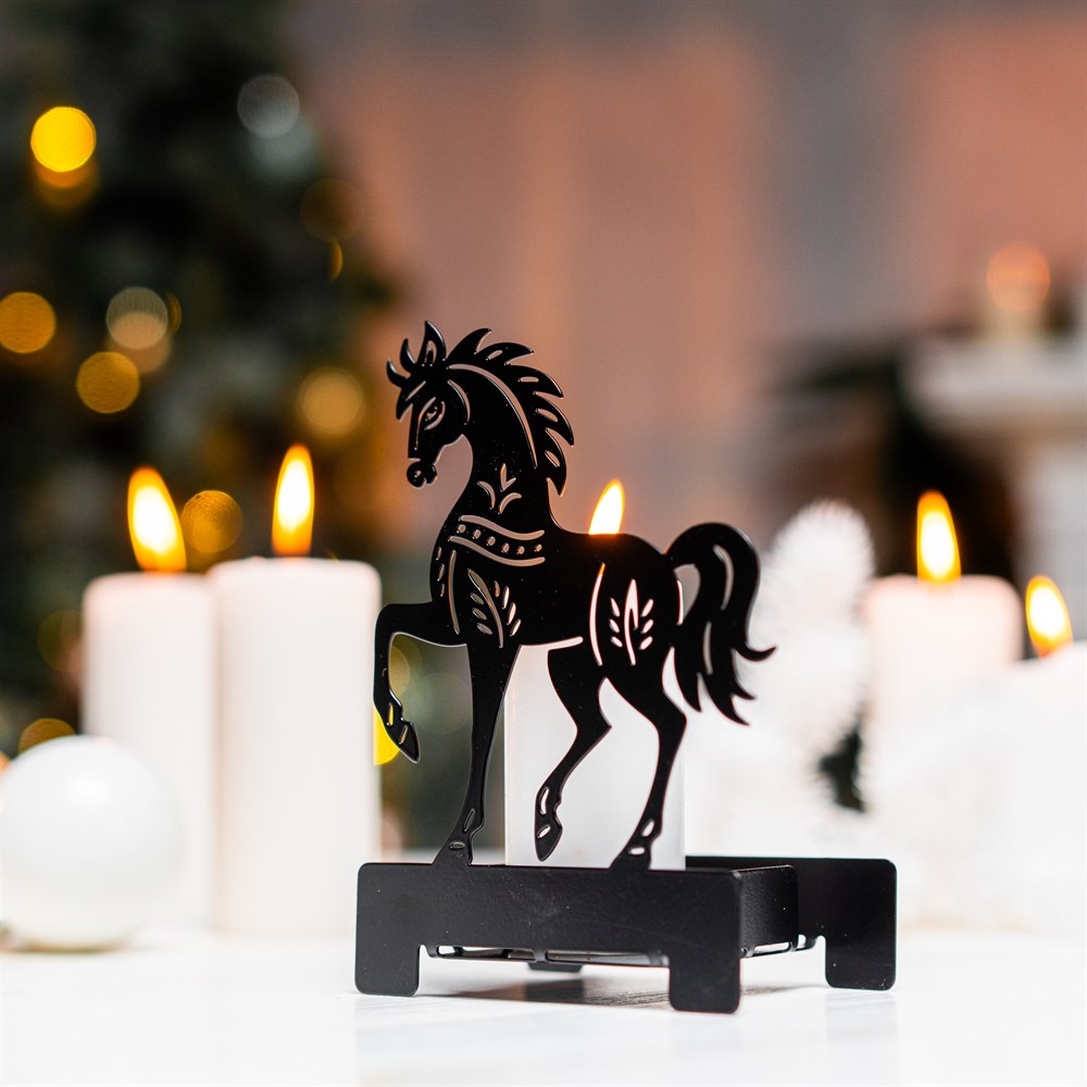Элегантный металлический подсвечник в форме силуэта Лошади 730-094B — не просто украшение, а талисман наступающего года. Тонкая лазерная резка создаёт ажурный, почти живой силуэт: в свете свечи тени мягко переплетаются, наполняя пространство умиротворением и лёгкой сказочностью. Идеально впишется в новогодний интерьер — будь то уютная гостиная с камином и красно-золотой ёлкой, или современный садовый центр с большими окнами и растениями. Подсвечник выполнен из прочного металла, устойчивая конструкция позволяет безопасно разместить чайную свечу или свечу-столбик.