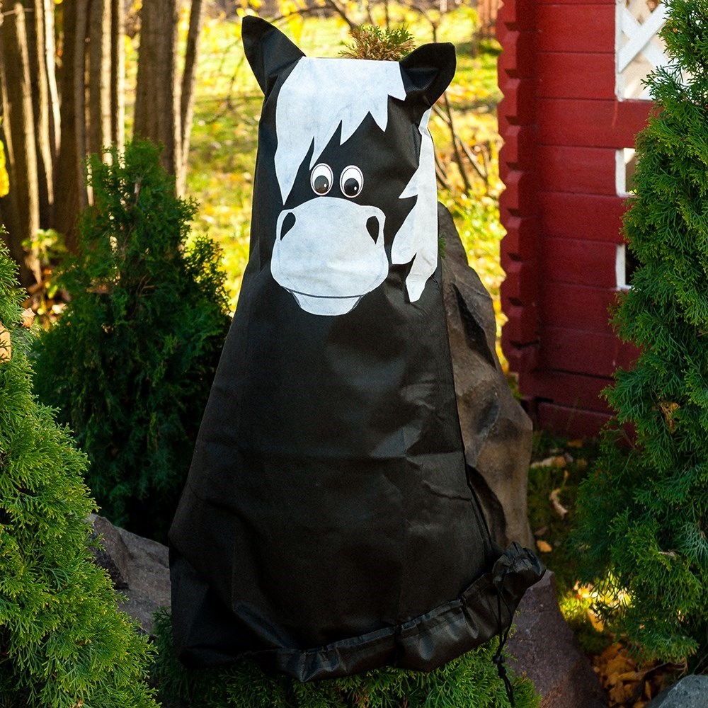 Укрывной колпак для растений Лошадка предназначен для защиты хвойников, кустарников, роз и винограда. Лошадка чехол для растений изготовлен из спандбонда — экологически чистого материала. Цвет колпака - чёрный. Размер — высота 1 м, ширина у основания 90 см. У основания колпака имеется кулиса с фиксатором, с помощью которого вы можете надежно зафиксировать колпак на растении.