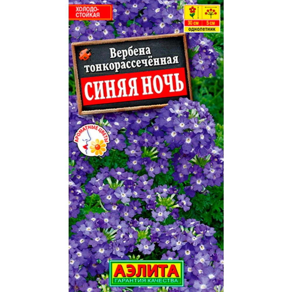 Высота растения 30 см. Низкорослое, обильноцветущее растение с ажурной зеленью. Кустики пышные, сильноразветвленные, высотой до 30 см. Многочисленные мелкие цветки собраны в сложные конечные соцветия 4-5 см. Цветение очень раннее (растения зацветают уже на стадии рассады) и продолжительное. Растения хорошо переносят недолгую засуху, выдерживают кратковременные заморозки. Вербена предпочитает открытые, солнечные места. Прекрасно смотрится в бордюрах, идеально подходит для озеленения балконов и подоконников. Посев на рассаду в марте стратифицированными семенами. Семена всходят в течение 3-х недель. Всходы плохо реагируют на избыточную влажность, увлажняют их только при подсыхании почвы. Пикировка в фазе двух настоящих листьев. В открытый грунт высаживают в середине мая.
